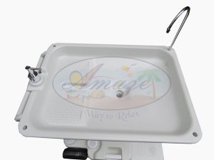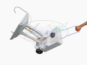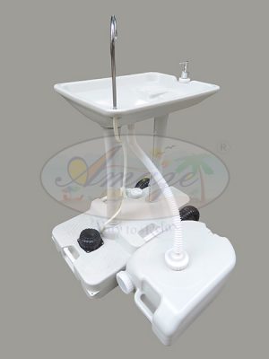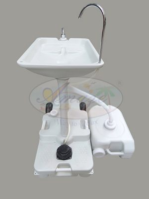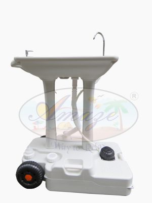 Construction and Features : A fresh water tank at bottom, capacity – 30 Litres. Hand wash sink Bowl – 55×40 Cm. Recessed cavity (Soap Storage Tank) within a sink bowl with capacity to store 5 Lit. liquid soap solution. Whole hand wash sink unit is equipped with 2 large wheels and pull handle. A Foot operated pump provided in a water tank to pump water from tank to the top faucet. Also supplied with 24 Litres capacity, p.p. waste water tank to collect waste water.