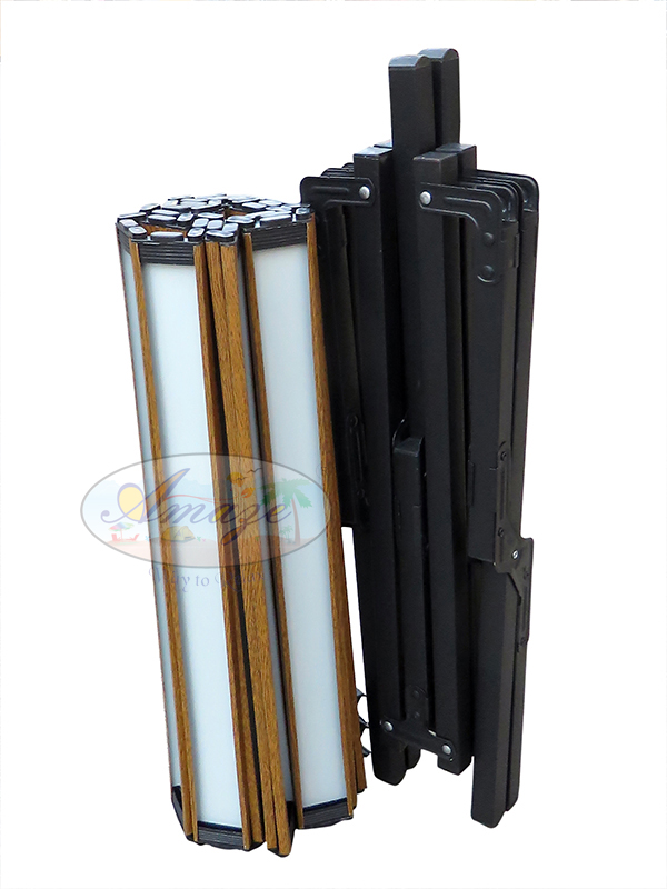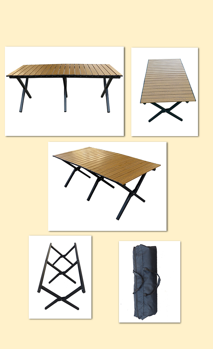 Multifold/Collapsible Top: The tabletop is made of a rigid material that can be folded into multiple sections or is a “roll-top” style with individual slats connected by elastic cords. This design allows the table to pack down to a very compact size.